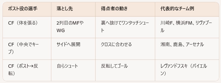 - ポストプレーがチーム全体の攻撃を支える: 一人のフォワードが攻撃の起点となることで、他の選手の動きが活き、ゴールのチャンスを大きく広げられる。