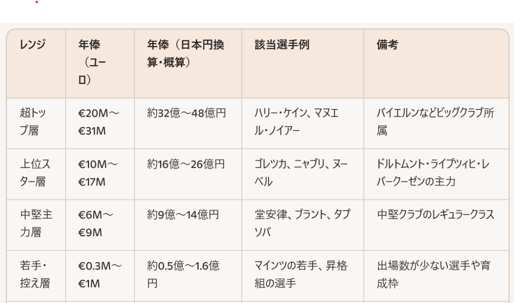 - マインツの平均年俸は約€1.7M(約2.6億円)だが、若手移籍直後の選手は平均よりやや低め。